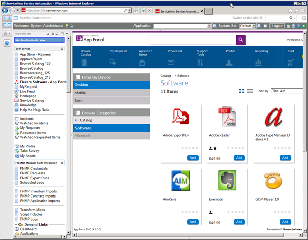 7. In the Self-Service menu, click Flexera Software App Portal . App Portal will open in the right pane of the ServiceNow interface.