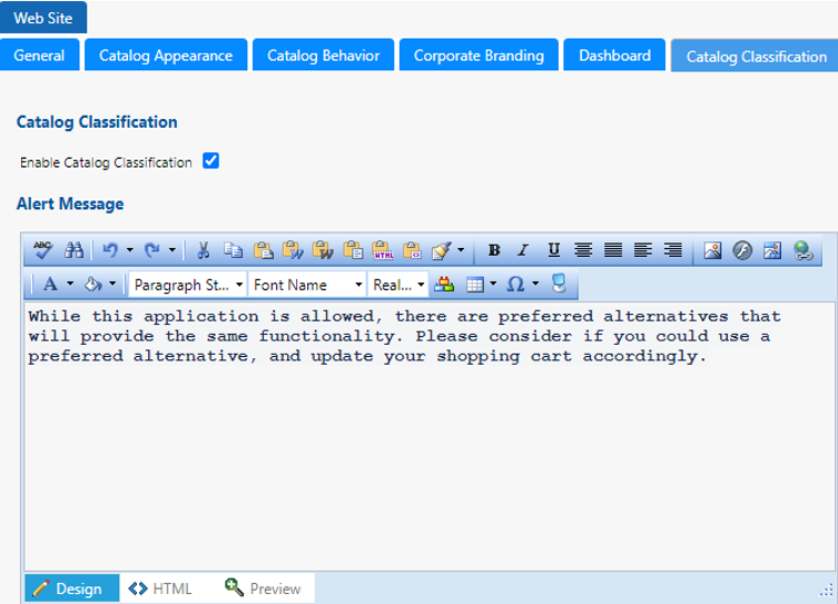 | Alert Message | Enter the alert message to be displayed when user selects a non-preferred catalog for checkout. The alert message in the image is added as an example. The alert message is empty out of the box. |