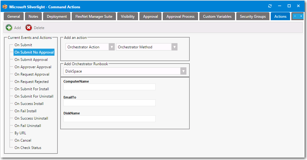 On Submit ApprovalorOn Fail Install). - From the Select a service list, select Orchestrator Action . Automatically, Orchestrator Method will be selected from the second drop down list.