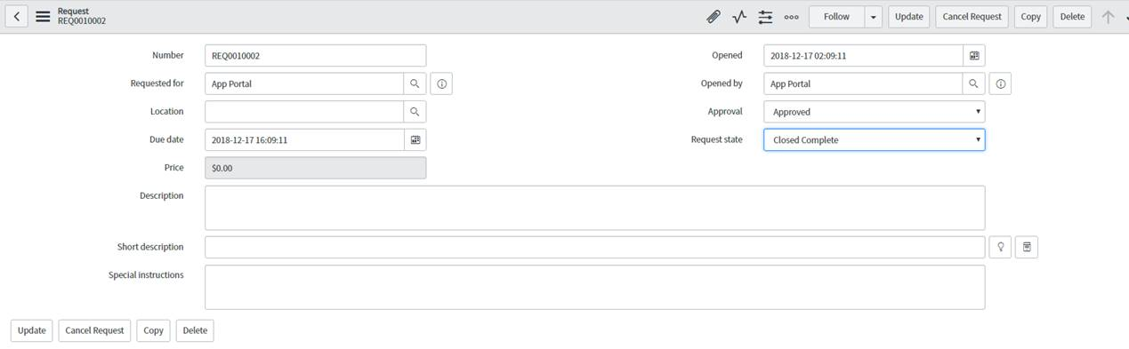 - Clicking one of the requests (REQ0010002) displays the request details. If the status is Success in App Portal, the Request State displays as Closed Complete .