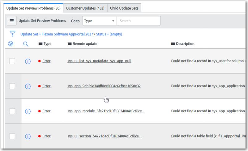 - Repeat this procedure until all errors are resolved. You may select multiple errors at a time. When all errors are resolved, the Commit Update Set button is enabled.