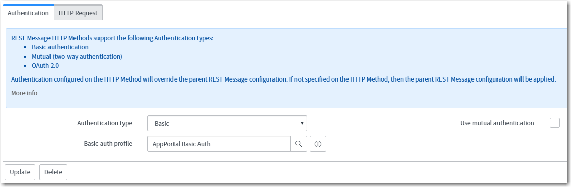 - On the Authentication tab, set Authentication type as desired for your organization. By default, None will be selected. Select the authentication type that the selected ServiceNow MID server should use to access the App Portal REST API.