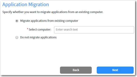 12. If you want to migrate applications from an existing computer to the target computer, select the Migrate applications from existing computer option. If you select this option, the Select computer field is displayed, where you are prompted to search for the existing computer.