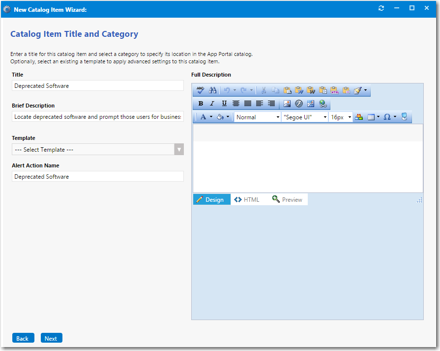 Select Alert Action Catalog Item and click Next . The Catalog Item Title and Category panel opens.