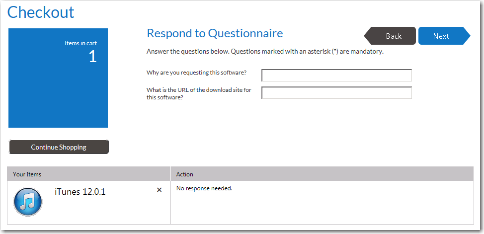 - If questions are associated with one of the catalog items in your cart, the Respond to Questionnaire panel will open during checkout.