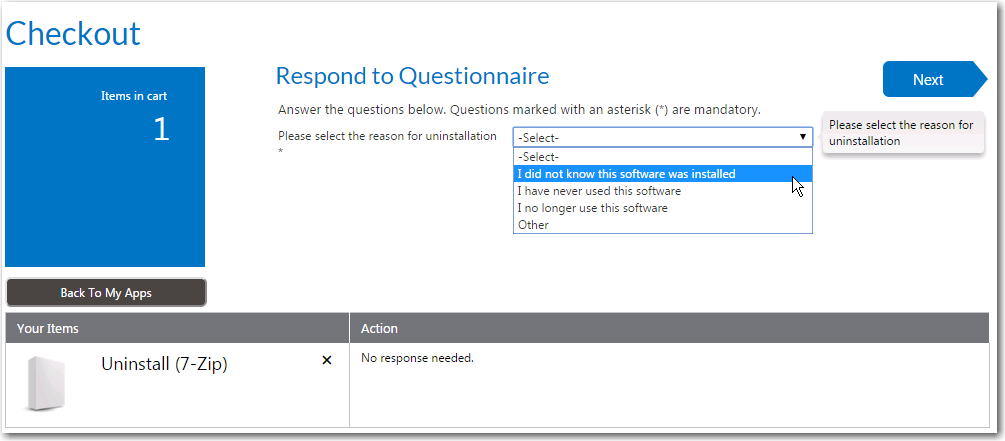 - Click Keep or Uninstall . The Respond to Questionnaire panel of the Checkout process opens, and you are prompted to specify why you want to keep or uninstall the application: