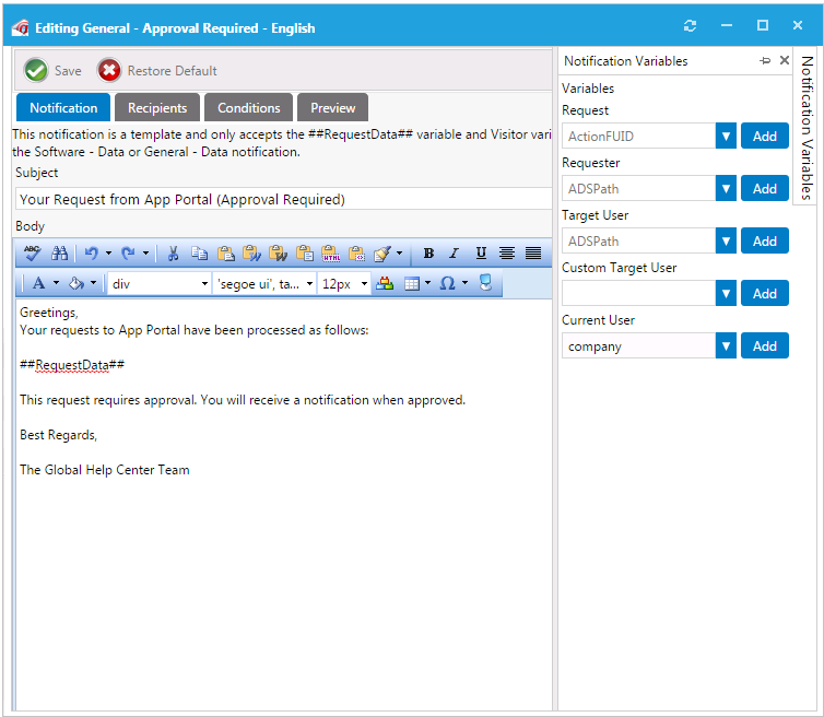 • When editing notifications, you can customize them to match your company brand by including company fonts, colors, and logos.